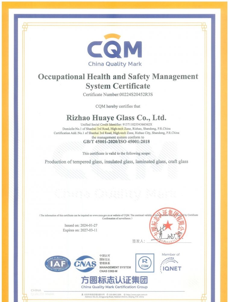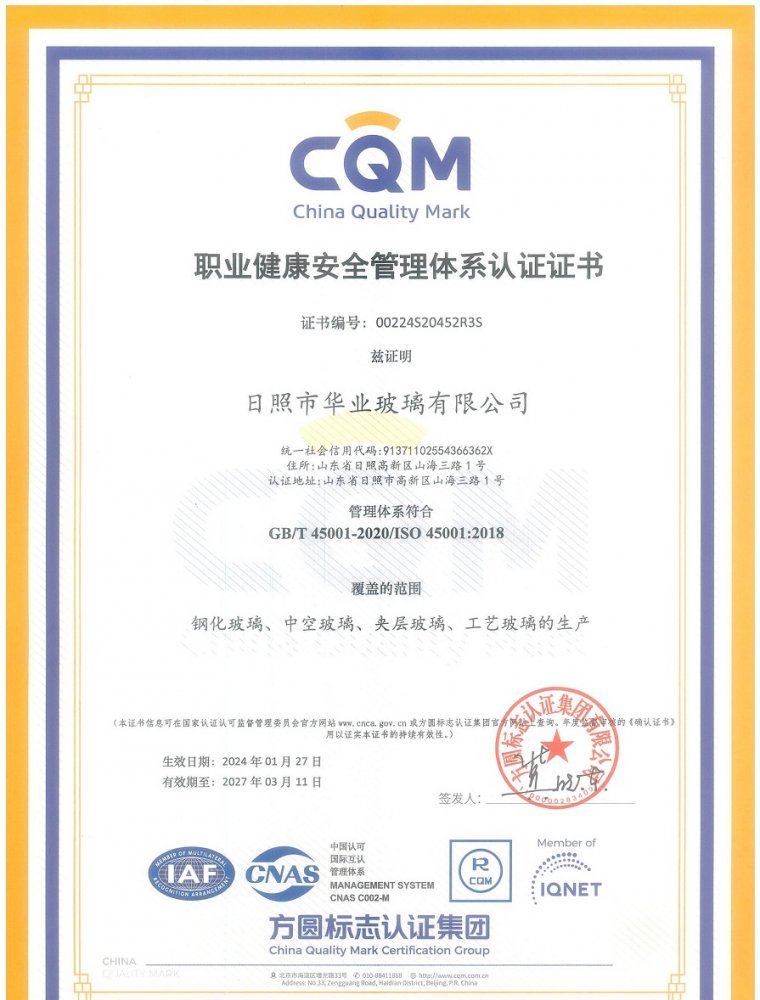 職業健康安全管理體系認證證書