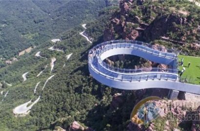 2018年6月12日,河南省新密市,經(jīng)過8個月的建設,伏羲山旅游區(qū)的懸空玻璃環(huán)廊正式落成,游人走在環(huán)廊上感受“天空漫步”的刺激體驗。據(jù)了解,伏羲山玻璃環(huán)廊將于6月16日起對外開放,該橋采用無斜拉索設計,整體工程用鋼量超3000噸,橋面使用150塊三層鋼化夾膠玻璃鋪設,距離峽谷地面360米,環(huán)廊伸出懸崖30米。比美國科羅拉多大峽谷號稱“世界第八大奇跡”的玻璃環(huán)廊還長出近9米,可謂是“世界很長的高空玻璃環(huán)廊”。